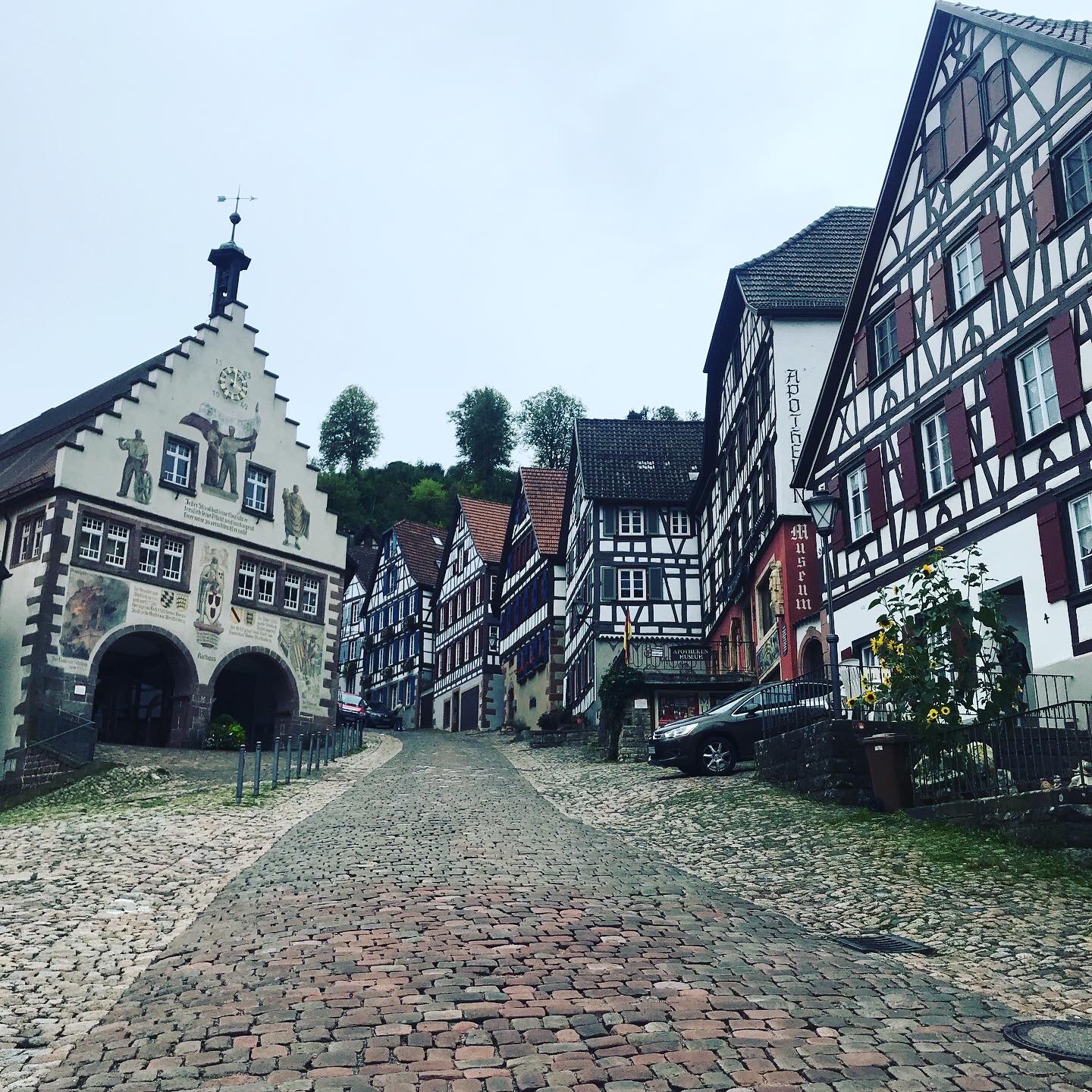 Just as I arrived at the bottom of the valley, it began to drizzle, but I was so close to my destination that I didn’t bother putting on my rain gear. Schiltach looks quite amazing when you arrive along the river as I did: a succession of half-timber houses spreading over the hillside like something out of a Grimm tale. At a local bakery, I had a slice of peach tart with some tea before checking into my hotel, the Sonne, on the market square. A quaint and creaky old place, with great owners and an excellent burger for dinner. At dinner, I found myself sitting one table away from a guy who had been at the Russian hotel that morning. He said he had seen me set off and so had been following me all day. He too is on the Mittelweg but only for a few days, stopping in Sankt Georgen tomorrow. We both agreed that the morning section along the old border was perhaps the most beautiful part of the trail so far. There was something truly magical about it.