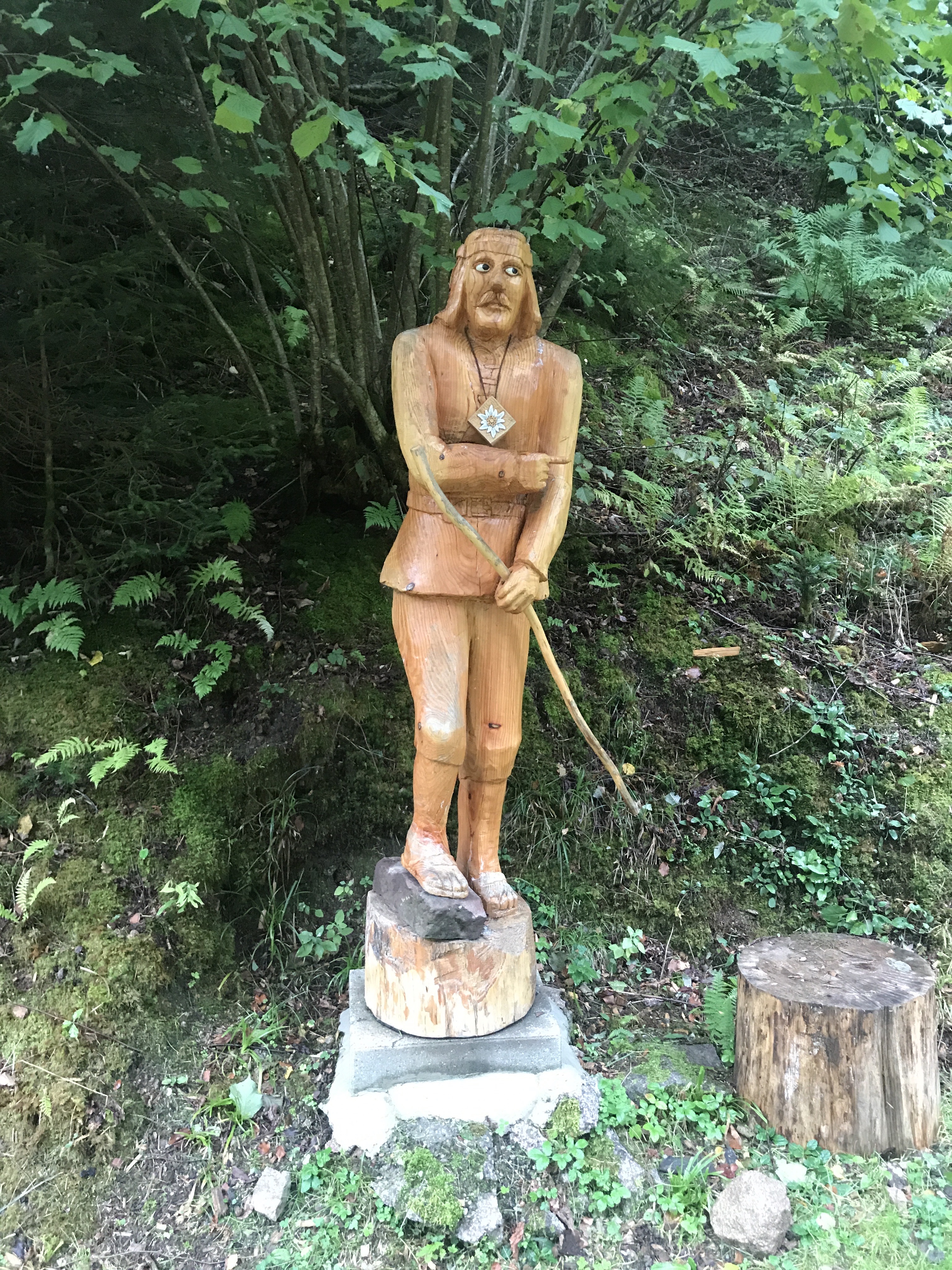 The rain of the previous day had cleared when I woke on the fifth morning. The hotel breakfast was good, with really strong coffee for once. And I needed it because the day began with a very steep climb out of the Schiltach valley. Part of it unfolded on a Bible-themed section with a very odd-looking Jesus and, at one point some low concrete posts painted blue with waves on them so that people could pretend to walk on water. That struck me as a little blasphemous. Unfortunately my trail veered off from the biblical one before the crucifixion, so I didn’t get to see how that was presented.