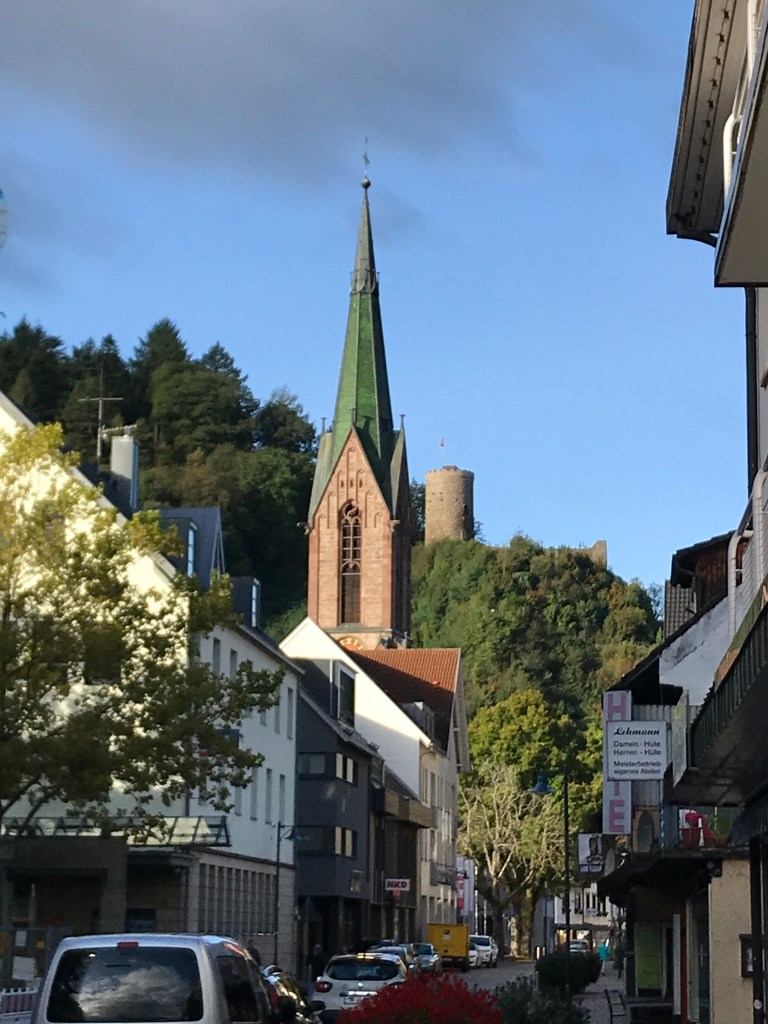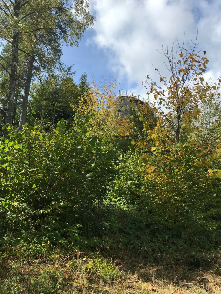 From the Blauen summit, there was a lengthy and relatively steep 800-metre descent to the town of Kandern. My hiking poles were a great help in keeping me upright on the often slippery downhill trail. I stopped for a few minutes at the Hexenplatz (the witches’ crossroads), another spooky spot with a warning about witches carved into the side of the hut standing there, and then again at the Sausenburg ruin. There was a tower to climb but it reminded me of the one that Bran Stark is thrown from in the first season of Game of Thrones, so I gave it a miss in case the same thing happened to me!