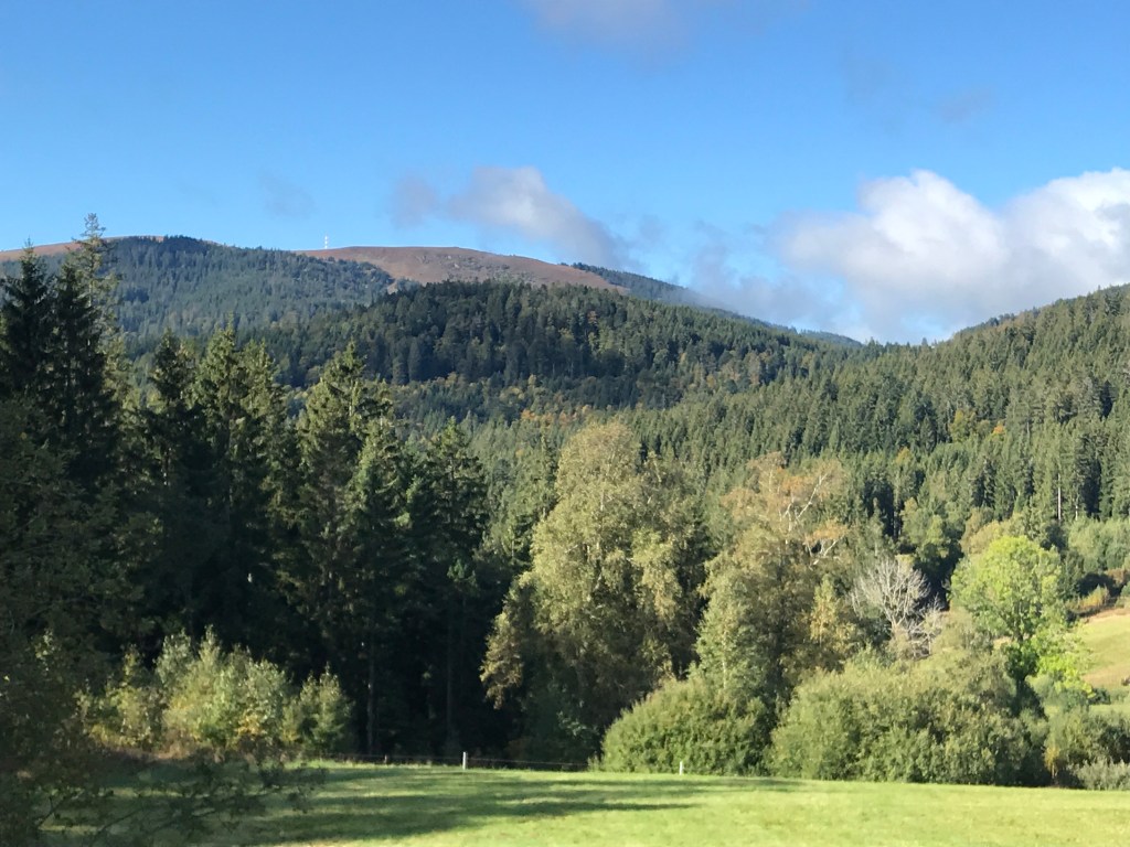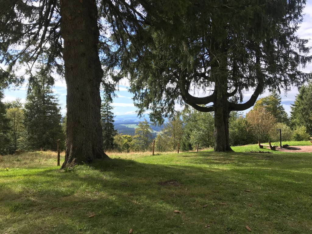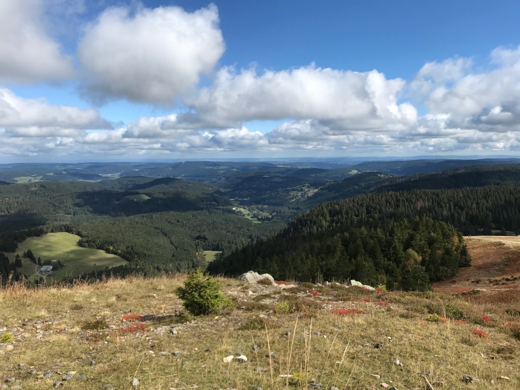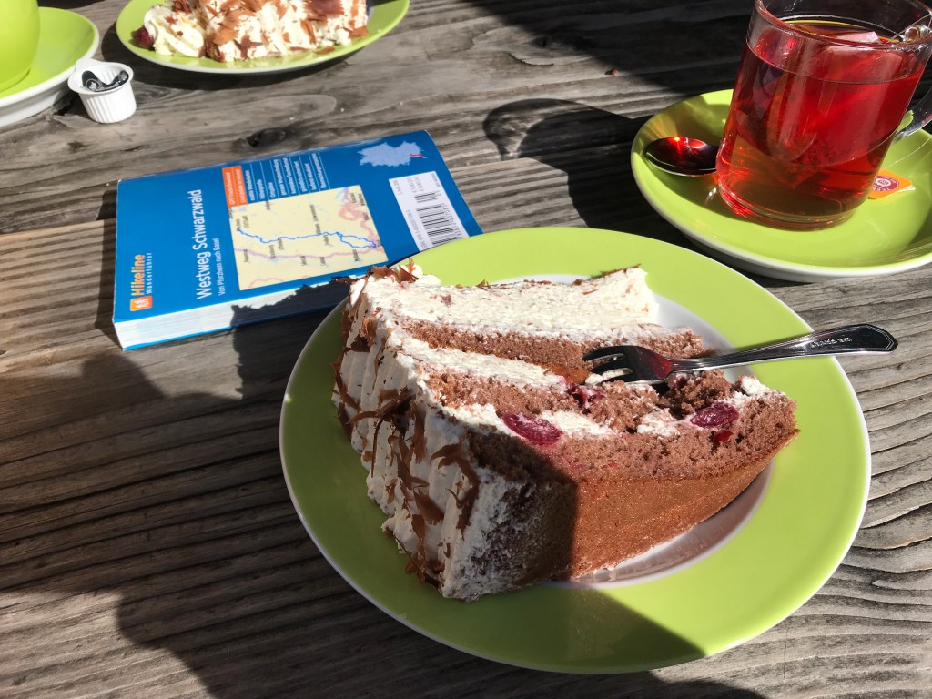 After that, it was an easy climb up to the gently rounded summit of the Feldberg, the highest point on the Westweg. There were huge crowds at the summit (most having arrived by car and then cable-car) and it was impossible to get a decent photo of the view. It was quite cloudy and a little chillier by then too, even though the clouds would blow over as I headed down from the summit to the Sankt Wilhelms Hutte. This place was packed, but I managed to find a seat at an outdoor table with two young couples and a guy who told me he had done the whole Westweg in three days by mountain-bike! I couldn’t understand all he said, but he seemed to be quite a character. As usual, I had a big slice of Black Forest cake with a warming cup of fruit tea. The perfect break.