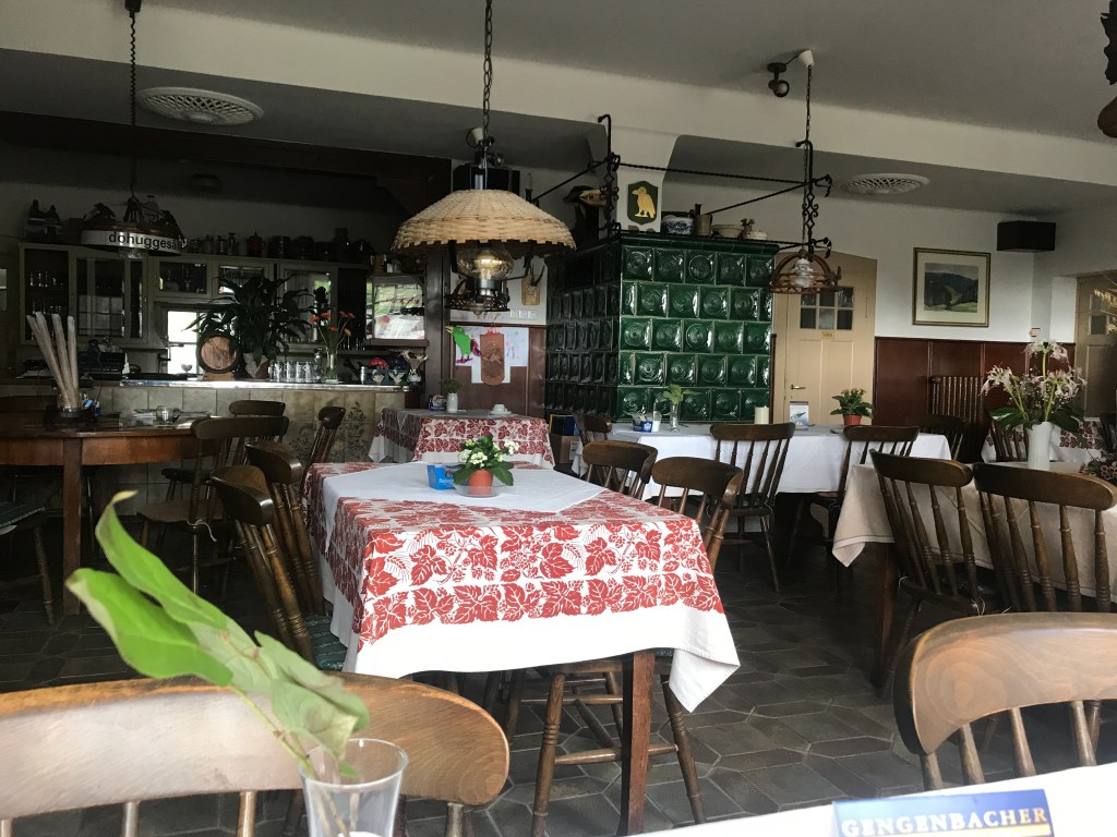 All morning, I had managed to keep a steady pace of just over 4 km an hour, which would mean arriving at the Kalte Herberge inn way too early (it was their day off, Ruhetag, and they had told me to arrive between 4 and 5 pm as they would only be around at that time to let me in). So I decided that a lunch stop would be necessary and, just after heading down from the Brend heights, I came across the Goldener Rabe restaurant. The owner was standing outside when I arrived and, as the place looked pretty sleepy, I asked if it was her “Ruhetag”. She instantly retorted, “Stupid question. Would the door be open if it was?” She then added, “Even when we’re open, no one comes.” Feeling a little sorry for her, and with no other food options along the trail for a while, I went inside all the same. The outdated dining room, with its old posters and advertising, was an instant throwback to the late 60s or early 70s. The menu was like an ancient document. And I had managed to find what must be the only inn in Germany without beer on tap! I plumped for a Zurich-style dish with spätzle which I thought would involve cheese but turned out to be a substantial helping of sautéed meat with mushrooms. I have no idea what the meat was but, from the way the hotel labrador stared at me dolefully as I was eating, I began to wonder if it might not have been a friend of his. A little old lady (at least I think it was a lady as it was hard to tell in the ambient gloom) appeared at a serving hatch now and then to say “Hallo” or “Guten Appetit”. It was a distinctly odd spot and I wondered how they could make a living. The owner, after her off-putting welcome, turned out to be pleasant enough, but I didn’t feel like hanging around too long and ate my meal faster than I should have done.