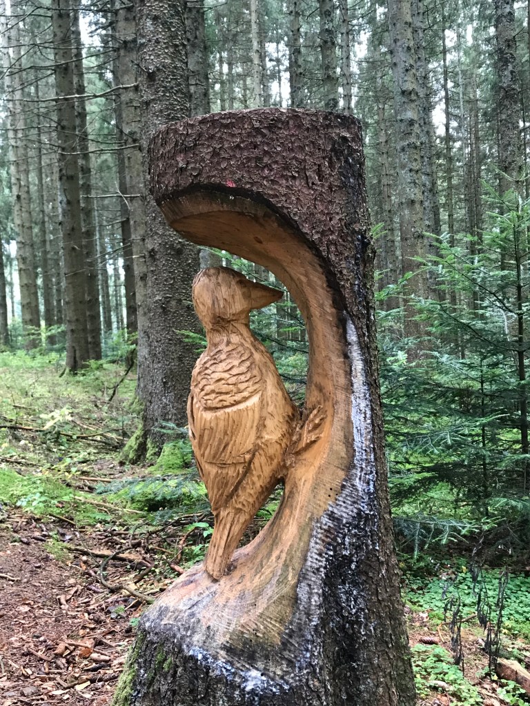 A little further on, just after the village of Neukirch, there was a spot where a sculptor had been at work on the old tree-trunks at the side of the trail. I particularly liked his woodpecker, which I found very witty and creative.