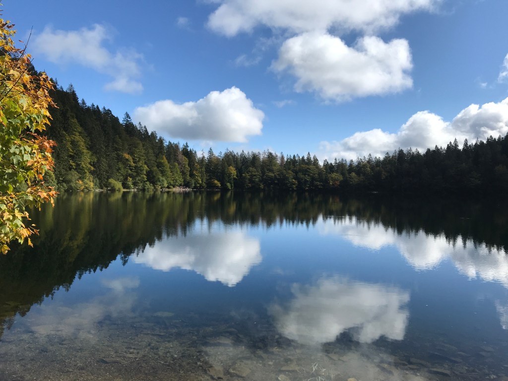 After the farms, the trail returned to the woods. One section I particularly liked this morning was around the Blindensee, a small lake at 1,000 metres. A long and very enjoyable boardwalk led across a marshy area to this pretty and almost circular lake.