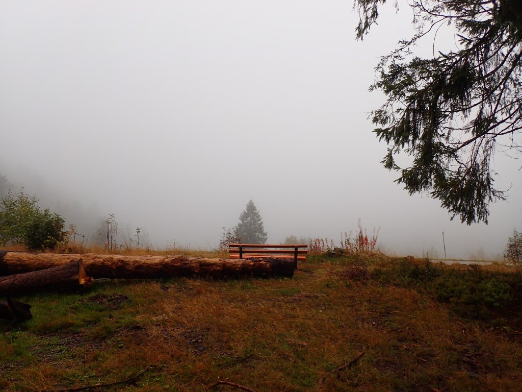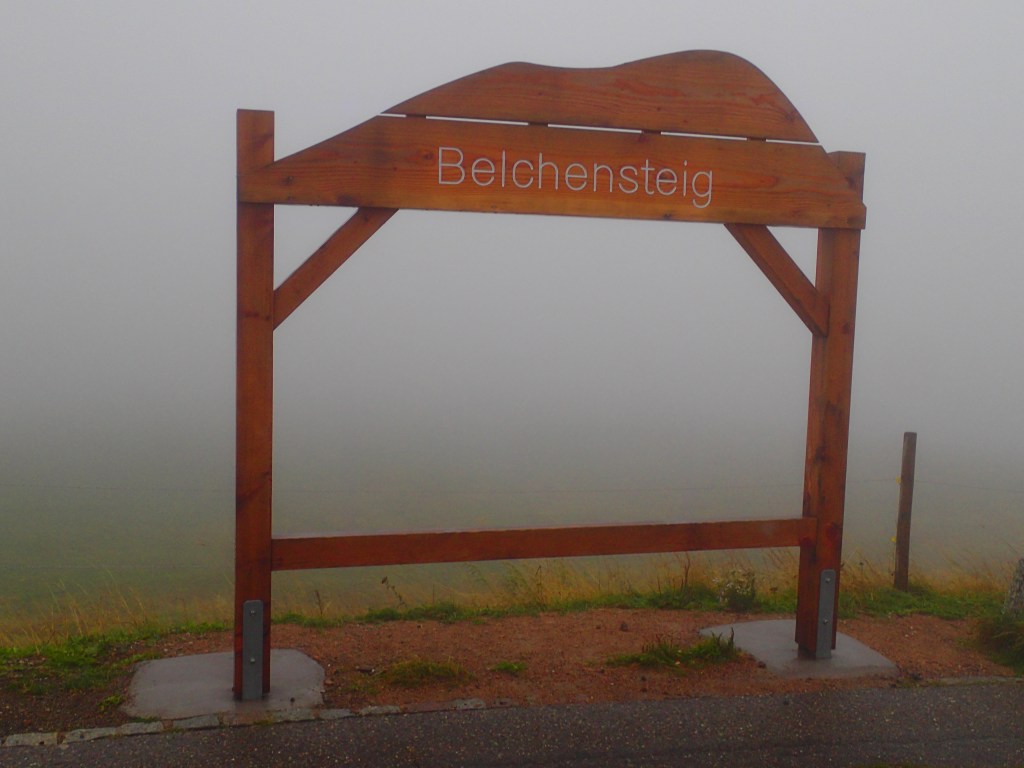 There was a sign just outside the restaurant pointing to the Westweg and I set off in that direction. It was tough to see very far ahead, but I managed to find a board with a tourist map, which I misread before setting off along a road that began to head downhill. I had never found myself in such thick fog before. The wind was terrifically strong but luckily there was no traffic on the road. I soon realized that something was wrong because there was a total lack of Westweg markers, so I turned and headed back uphill. My GPS showed a path descending from the road so I tried to find that, thinking it was the Westweg. Luckily, at that point, I met a group of young hikers who told me that the path in question came from a roadside parking lot rather than Haldenhof. They got out a phone to check an app, which showed that the Westweg to Haldenhof was further up, near the board with the tourist map. I couldn’t see much at all by now as my glasses were wet on both sides from the wind and the fog. However, just then, through a brief gap in the fog, we spotted a Westweg sign at the spot indicated by the app, then another pointing along the path. I thanked them as they headed off to the summit, making sure to note the name of their incredibly precise app. Since that time, Komoot has become my favourite tool when hiking (I’ll do a blog post about it soon).