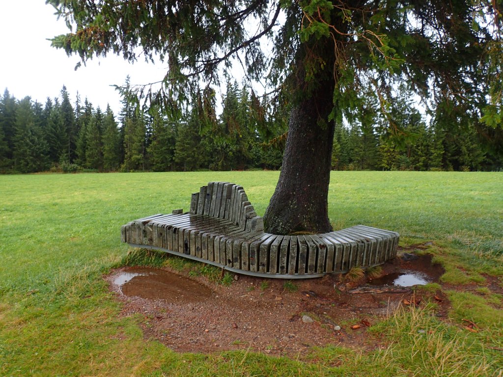 The trail headed gently uphill to the 1200 metre line, passing the Landsitz, a very elegant bench made entirely of slabs of wood standing on end. Once again, the map in the guidebook had it down as a good viewpoint, but I couldn’t see far and the bench was far to wet to sit on. A great picnic spot for the summer though.