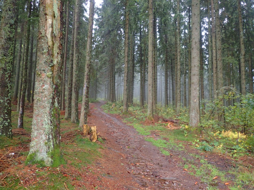 The descent was a little scary at first, on a narrow, wet track with a few stony and root-covered sections, in the howling wind and with my drenched glasses. However, after about 15 minutes, I returned to the cover of the woods that seemed to break up the fog and, after that, everything was much easier, leading down to the forestry trail that would take me all the way to Haldenhof.