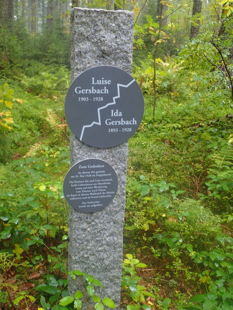 About 5 or 6 km before Titisee, I came across a modern looking memorial to two female cousins, schoolteachers in Mannheim, who were brutally murdered on the spot in 1928. The murderer was never found. When a gust of wind stirred a bush behind me, my blood ran cold and I got away from there as fast as I could. After the eerie moments on the first half of the trail, with its Macbeth-like moments, this discreet memorial added to the almost supernatural atmosphere that reigns along the trail on damp and misty days.