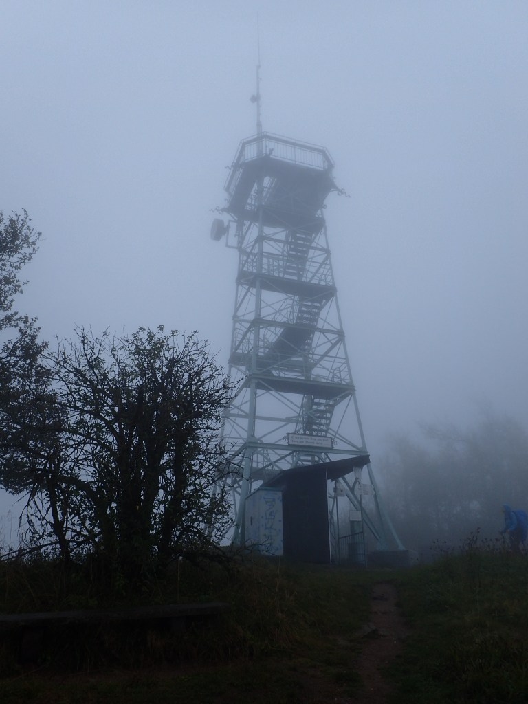 The climb through the woods to the Blauen at 1,164 metres was very pleasant, atmospheric and relatively easy, apart from one steep and rocky section on the last 200 metres before the top. I emerged at the foot of a viewing tower which would have been great to climb on a clear day but, by now, the fog was almost as thick as on the Belchen the day before, albeit without the high wind. Once again, I was on a Black Forest summit renowned for its view and unable to see a thing.