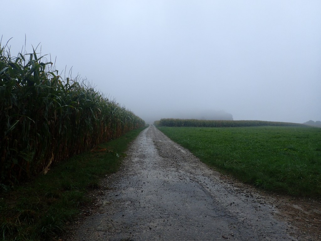 From the castle, the trail descended to the church in Rötteln and that’s where the rain began to fall. I had seen it from a distance, a thick, grey curtain heading up the valley. It began bucketing down like the previous afternoon as I headed uphill on the final climb of the trail through cornfields, mostly on roads and muddy tracks.