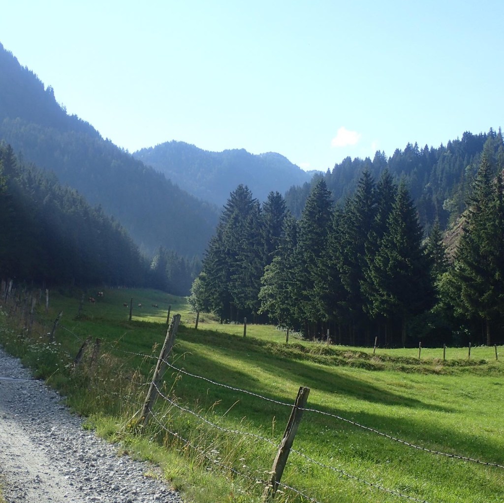 As the pension did not serve meals, the owner advised us to head back up to the village inn for dinner. This meant adding another three or four km there and back to our total for the day. So, after a shower and a change of clothes, we set off. More rain was forecast and the sky was already grey. Just as we arrived at the inn, a young guy pulled up in his car on the opposite side of the street, got out, and hailed us like two old friends, asking us how our day had been, if we’d been able to deal with the weather, etc. Another example of the sheer friendliness of the locals in this part of Austria.