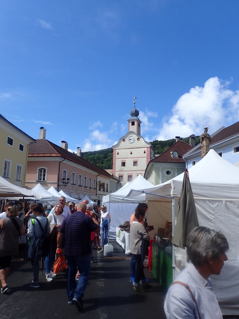 Gmünd was a pretty, very artistic little town where the main street had been taken over by a crafts market of incredibly high quality. As we strolled around after coffee before returning to the trail, Odile’s gaze was drawn to the dresses, skirts and tops displayed on the stall of a charming Slovenian lady. They were beautifully designed and in a very light fabric, meaning they would take up very little space in the pack. So, Odile asked if she could try on a dress. Unfortunately, she had forgotten that she was still wearing her rain pants and began to take them off without removing her boots first. Hopping around on the spot, she instantly lost her balance and began to teeter at an alarming rate towards the adjacent pottery stall. I don’t think I’ll ever forget the look on the potter’s face as he envisioned the proverbial bull in a china shop in the guise of my wife about to shatter his wares. Luckily, thanks to a team effort by the Slovenian lady, myself and the potter who never stopped puffing his pipe, we caught Odile just in time, but it was a close call. After that, the least we could do was buy a top and a skirt. As for the potter, I think he was glad to see the back of us.