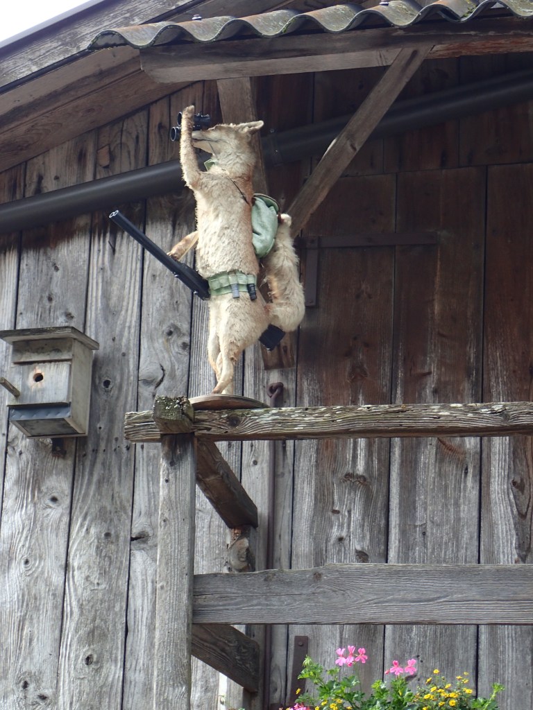 It was still raining when we set off again. Outside the hut, we were treated to the rather unusual spectacle of a tiny but virulent dachshund tugging at the ear of a recently slaughtered stag. The dog’s owner was delighted and kept filming his pet’s antics, but there was something unsettling about the scene and we didn’t linger.