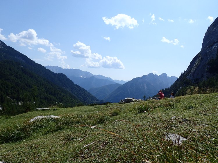 Shortly after emerging onto the road, we spotted someone lying flat out, with another person apparently trying to revive them. We ran towards them, shouting to ask if they needed help. They turned out to be two German ladies. The one lying down was perfectly fine, simply relaxing, while what we took for CPR from a distance were stretching exercises her friend was putting her through! They had both suffered on the descent and one of them told me that she had sworn never to hike over stony terrain again after a hike in Scotland, but had then had a very unpleasant surprise since arriving in Slovenia where the terrain was even worse.