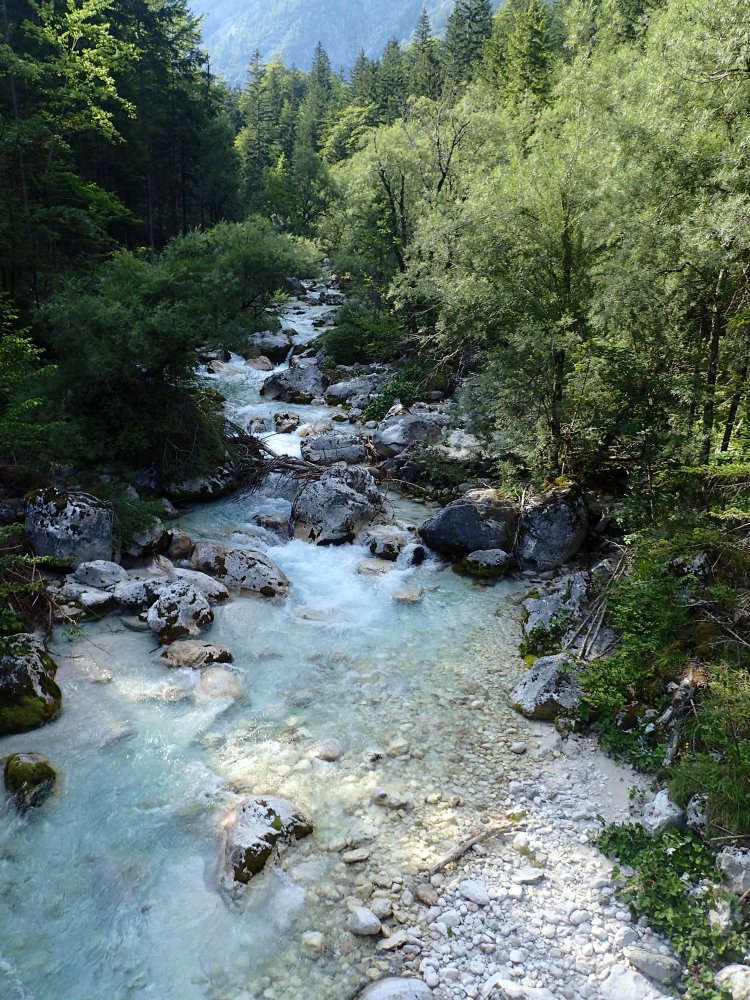 Despite our exhaustion (by the time we reached Trenta, we would have covered over 60 km since leaving Baumgartner Höhe), we were nonetheless delighted to finally discover the Soca, the river that would accompany us for a fair share of the remainder of the Alpe-Adria, either as the Soca or the Isonzo once we crossed into Italy. The photos we had seen before leaving hadn’t really prepared us for the beauty of this amazing river with its crystal-clear waters.
