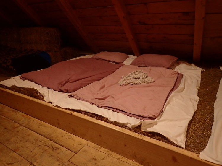 We finally staggered into Trenta at around 6 pm, eager to discover the organic farm and hostel run by Polona’s friend Stanka. However, on reaching the main square of the tiny village (and getting another marker point on our Alpe-Adria app) we discovered that the farm was another 2.5 km further on, with another climb to reach it along a narrow road, where we lost the trail again and went another few hundred metres out of our way. Fortunately, Polona had called ahead to say we would be wanting dinner. When we arrived at the farm at 6:40, Stanka’s youngest son informed us that dinner was at 7 o’clock. He showed us to our accommodation in the hayloft (more about that in the next paragraph) and, after a quick shower, we took our seats at 7:05 for a terrific dinner served by Stanka’s husband and their oldest son: lentil soup, then a salad of freshly picked tomatoes, followed by pork and lamb sausage, served with a blend of rice, spelt and barley, veggies and a little fresh sheep’s cheese, and finally, for dessert, a plum crumble with a layer of crème pâtisserie between the fruit and crust. This was washed down by a delicious local hemp beer before a bottle of “digestive” schnapps was left on our table to conclude the meal. Apart from the hemp beer, everything that we consumed (including the schnapps) had been produced on the farm. One of the best meals since setting off 21 days earlier. Stanka had been slaving away in the kitchen throughout dinner, but we got to talk to her after just outside the hayloft and she turned out to be a lovely lady, kind and generous (as we had sensed from her cooking).