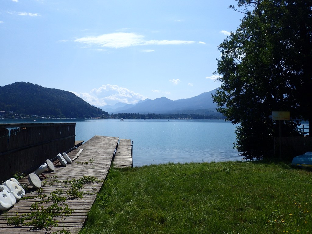 On emerging from the woods, we had a long slog along the banks of the Drau. There was not a scrap of shade along this section and the sun was already beating down. However, there was a light breeze blowing to take the edge off the heat and, after crossing the motorway and the pretty village of Bogenfeld (where a charming old lady urged us on), we came across a thoughtfully positioned drinks’ dispenser after a steep climb. Revived by a cool drink and coffee, we then had a brief section along a busy road before veering off to follow the path around the Faaker See, once again trying to dodge all the bicycles. We found this lake much more pleasant than Velden. There were pretty little holiday huts at the water’s edge and much less bling on display. The whole place seemed much more normal, with a pleasantly nostalgic air of summer holidays in simpler times.