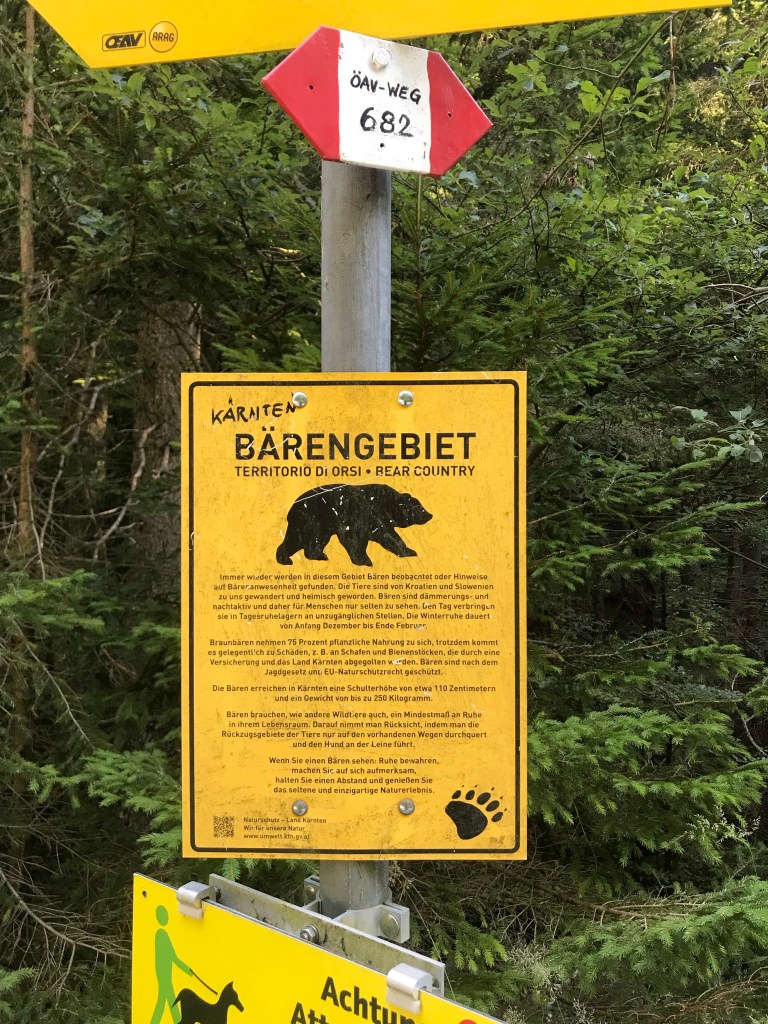 After a fine breakfast on the hotel terrace, we set off beneath clear blue skies, eager to reach Kranjska Gora and meet up with three Slovenian friends. We were surprised to find the trail heading downhill at first but that soon changed and the steep climb began through the woods to the Jepcasattel where we would cross into Slovenia and say goodbye to Austria. Just after a spring at around 1100 metres, we came across a sign warning us about the presence of bears. We knew there were plenty in Slovenia (my friend Polona had sent me a video of one in her back yard), but we had no idea they could be found on this side of the border too. Shortly after, I heard a grunt that seemed to come from the woods to the left. Odile swore she hadn’t made a sound and that she didn’t hear the grunt, but I like to think that there was maybe a bear foraging a short distance away.