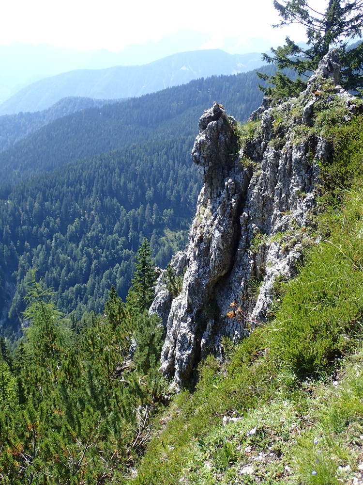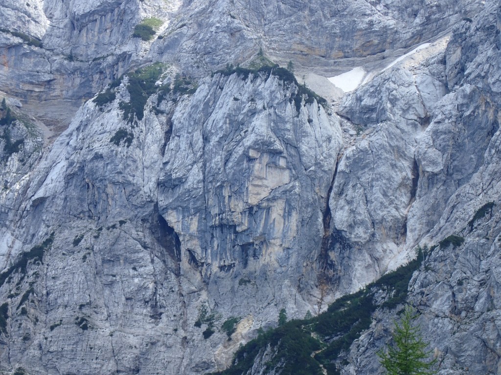 After our stop at the mountain hut, one guidebook showed the trail as following the road to the pass, which we did not want to do, while the other indicated a way through the woods. The latter, despite the total absence of trail markings, turned out to be the ideal solution. It seemed to be an old drover’s trail to the pass, fallen into disuse since the opening of the road and now only used by hikers. It made for a very easy climb with a lot of shade (that those sheep clearly didn’t know about!), avoiding the pass itself to lead us directly to a spot opposite the Pagan Girl rock, providing a terrific view of it. Legend says that a young maiden who prophesied the death of a legendary chamois buck was turned into a rock as punishment and has overlooked the Vrsic Pass ever since. A face could indeed be made out on the mountainside, as shown in the photo just below.