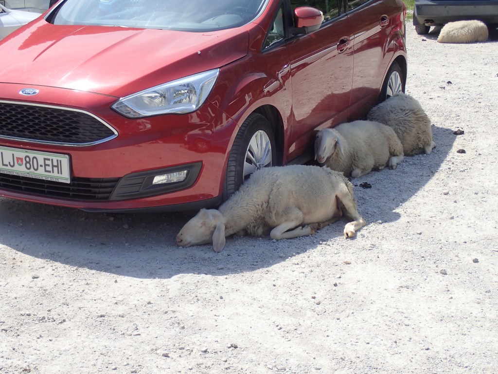 Fortunately, this section was soon over and, shortly after a small military cemetery (again from World War One, a conflict whose presence would become more and more visible along the remainder of the trail), we reached the car park of a small mountain restaurant were we stopped for a drink of blueberry juice and sparkling water. It was a beautiful little spot, made memorable by the huge numbers of sheep basking in the shade of the vehicles on the car park and that refused to move, even when drivers started their cars to leave.