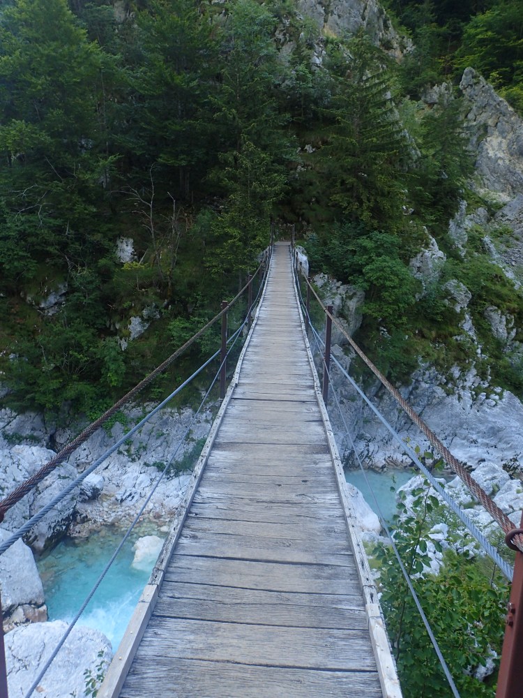There were plenty of people out and about on this sunny and pleasantly warm holiday morning, but we didn’t really come across the crowds until we descended to the Soča again. The road along the valley was very busy and we decided to skip a visit to the Boka waterfall, one of the highest in the country, because of the sheer numbers of people heading up there. It looked spectacular from the bridge below, but we preferred to carry on our way, crossing back over the Soča river where we saw huge numbers of people in kayaks and on rafts. The trail continued to follow the river along a stony path, at times some way above it.