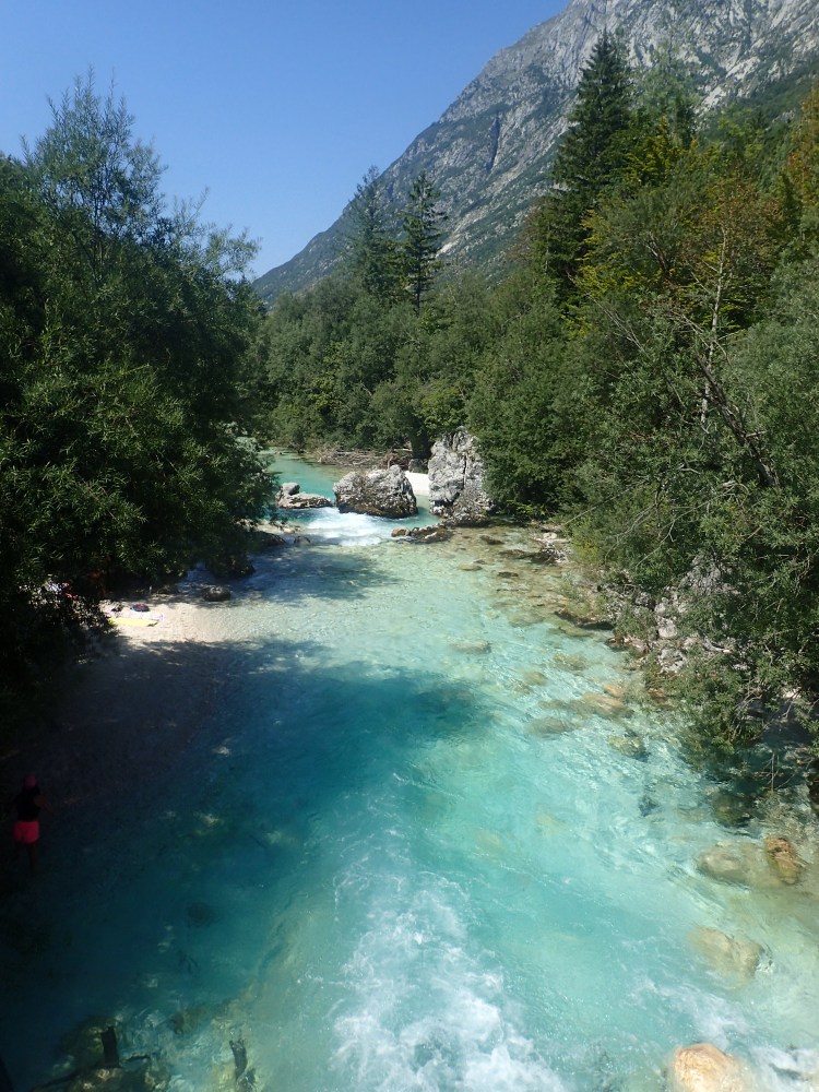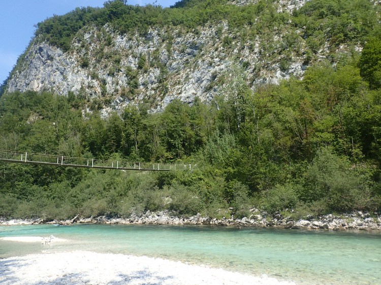 It was quite difficult to get down to the water where we wanted to make a rest stop around midday. However, at one point, Odile spotted a bridge over the Soča with a beach just below it. We ended up staying there from midday until 2 pm, dozing in the shade and taking chilly dips in the very cold water. In the time we were there, around 20 rafting groups passed by, along with 60 kayaks or so. The river is clearly a huge generator of revenue around here.