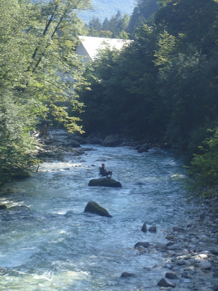 After a good rest, we carried on to Bovec, crossing the river again a number of times as the trail switched from bank to bank. On crossing one last bridge to a campsite just outside Bovec, we spotted a guy on a camp chair on a rock in the middle of the river, making the most of the shade and cool water. He clearly had the right idea!