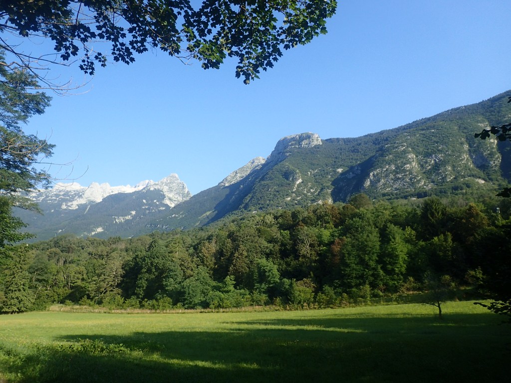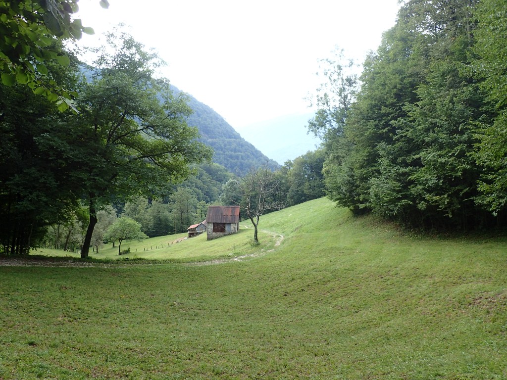 We then set off for a fairly easy 23-km hike to Mazgozd, where we would be taking our second rest day. We set off before 8 AM and the conditions were perfect, with an easy, steady climb through meadows and woods, passing under the cable-car to a barren, rocky peak that loomed over us, before reaching a turn-off to the Virje waterfall where we headed down to take a look at what is known as one of Slovenia’s most romantic waterfalls. It was indeed pretty but had slowed to a trickle in the peak of summer and the pond of green slime at its foot didn’t show it to the best of its advantage.