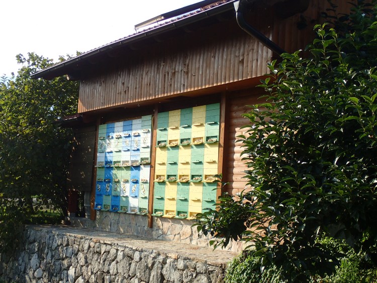 At around 3 pm, we arrived in Mazgozd where we had booked a rather unusual house for two days. The place was easy to find thanks to the owner’s instructions and there was a trough of icy water filled with drinks for hikers just outside. Half the house was made up of a large number of beehives. Our accommodation was in the other half and there was one section where we could open a shutter to view the bees at work behind glass. There were also masks hooked up to pipes that allowed us to inhale the air from the hives, rich in propolis and other good things. The whole place was beautifully designed with a huge bedroom upstairs and a very modern bathroom with a great shower. There was a comfortable terrace outside where we could hear the continual buzzing of the bees on the other side of the building.