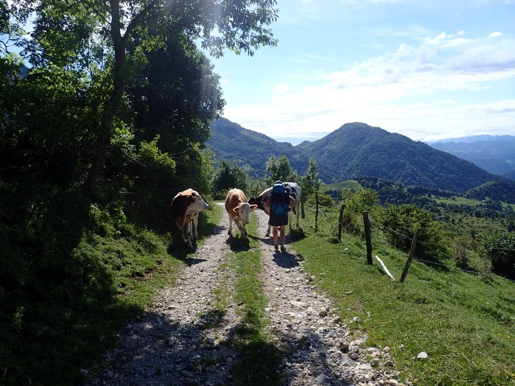 Shortly after the chapel, we crossed a pass and began our 1,000-metre descent to Tolmin. There was a wide, cow-lined track down from the pass where we saw our first fellow hikers of the day who were heading uphill.