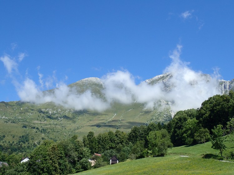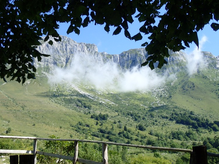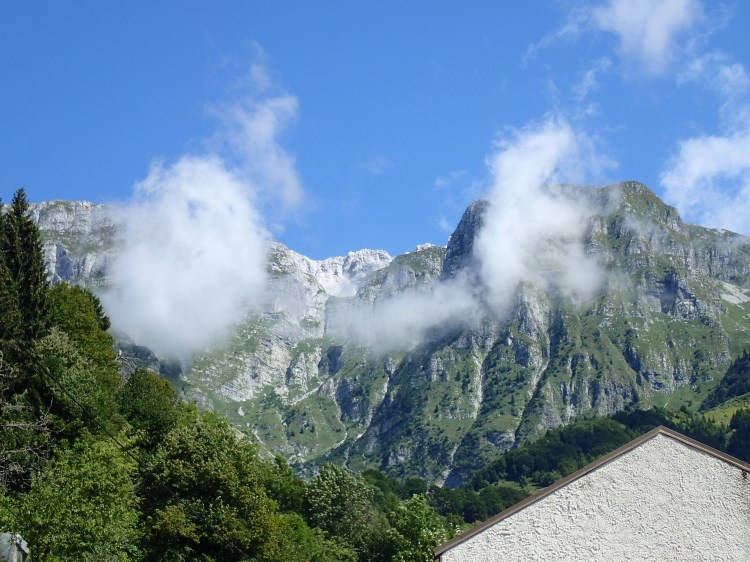 We followed this track to the Kuhinja mountain hut, a glorious spot in a very picturesque setting where we had a late second breakfast/early lunch made up of a tasty Slovenian soup with sausage. As we ate, we saw numerous shifting clouds forming against the magnificent mountains above us, probably vapour from last night’s storm as the sun began to warm the wet ground. They created a magical spectacle as we sat in the shade of the trees outside the hut. There too, we saw a couple of other people, but they weren’t hikers as they had simply driven up to the hut to eat.