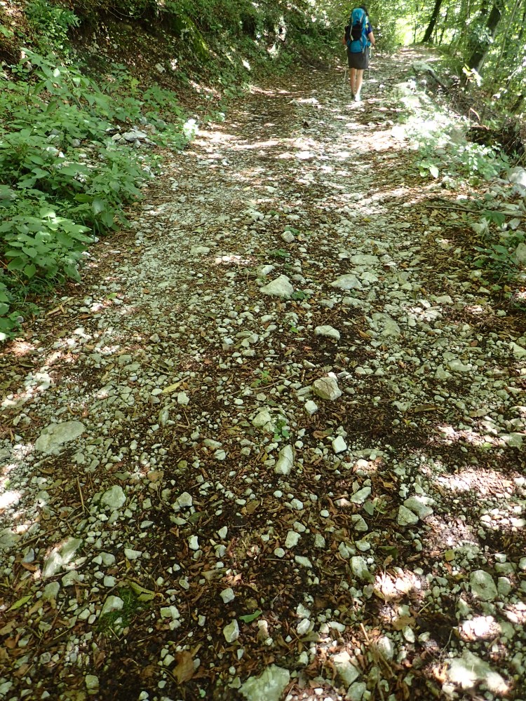 When we resumed walking, the going was fairly easy but with steep climbs now and then in the afternoon heat. We headed higher and higher above the river through woods that provided some welcome shade along the track that was made up of white stones and gravel.