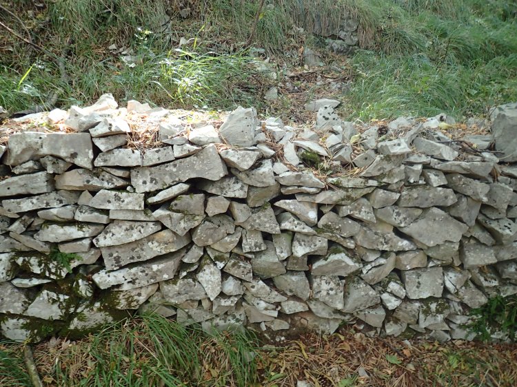After reaching the top of the Monte Belvedere, we headed along the ridge before turning left and going downhill, crossing some open land in the middle of the woods and then a major road to reach the village of Trebiciano. From there, we headed across country through a mixture of woods and meadows with stone walls to Gropada.