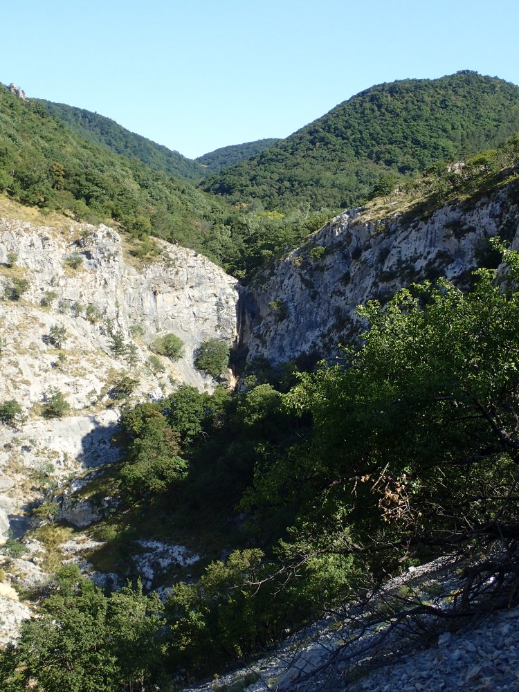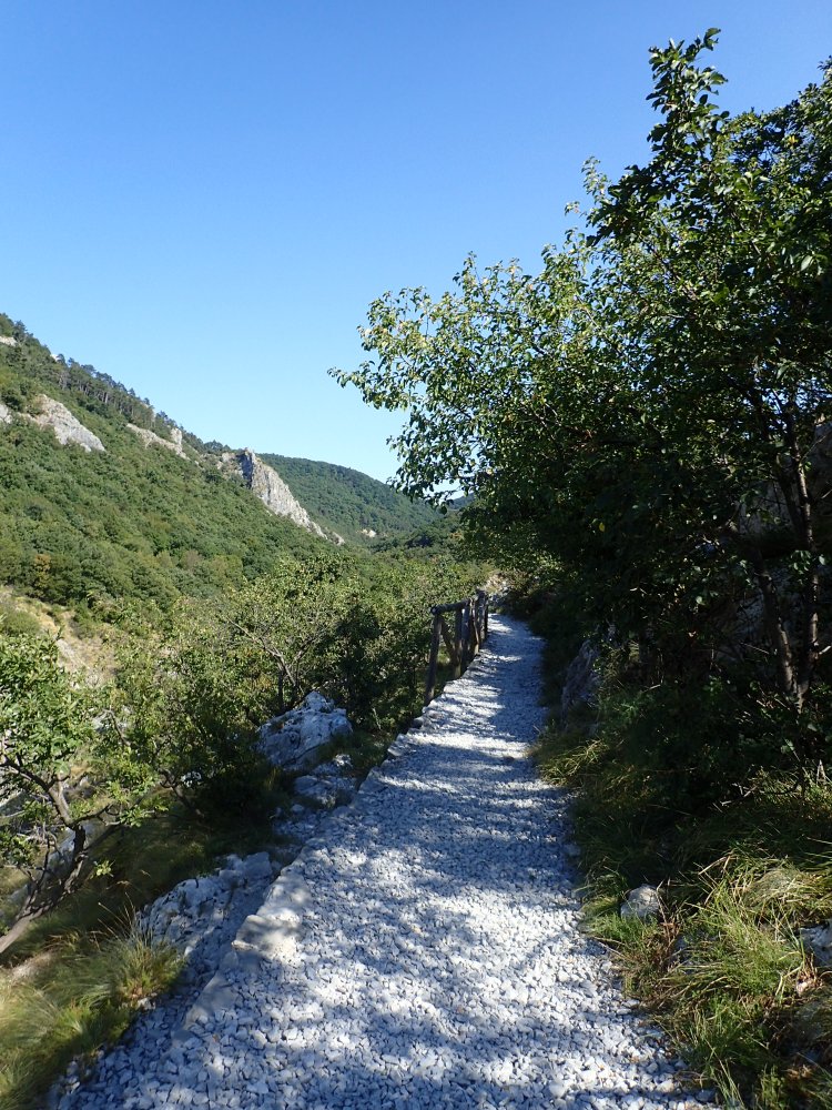 We left the cycle track for a sharp and stony descent to the hamlet of Bottazzo before climbing up again to the path that we had seen from afar. This was another gorgeous section of trail, high above the Rosandra as it flowed through the gorge below. The track was stony, but more like a gravel path than the nightmare trails of Slovenia, so the walking was easy. For once, there were quite a few people about, not a big crowd, just the occasional couple or group of friends out for a walk in this beautiful valley.