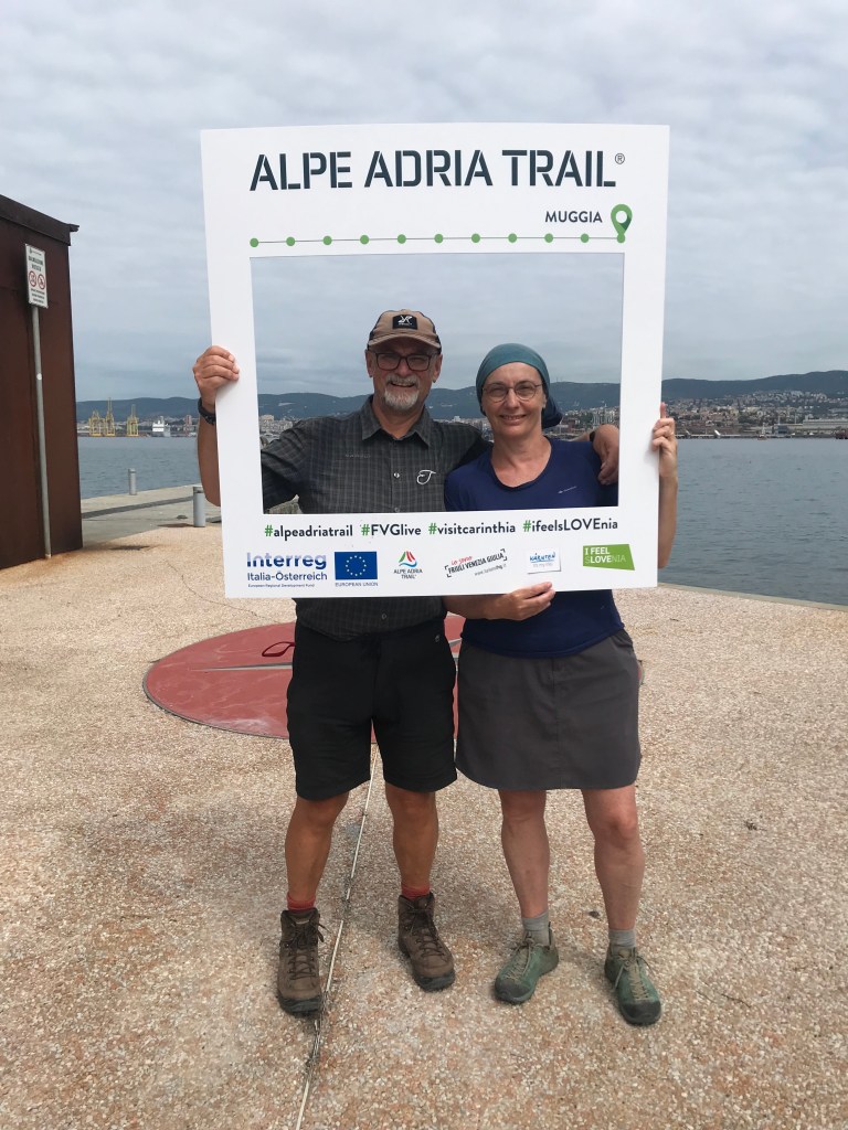 And, before we knew it, we found ourselves in Muggia, amid the crowds in the outdoor cafés having a pre-lunch aperitif. We didn’t linger there but went straight to the Alpe-Adria office near the harbour. We were actually quite emotional on completing the trail and, after sobbing for a minute in each other’s arms, we composed ourselves and went into the office where we related our experiences to a delightful young woman who took our photo with an Alpe-Adria frame, told us that she was seeing many more through-hikers doing the whole trail since the lifting of anti-Covid measures (two or three a day at times) and then recommended a nearby restaurant for lunch (it was 1 pm so the ideal time for it).