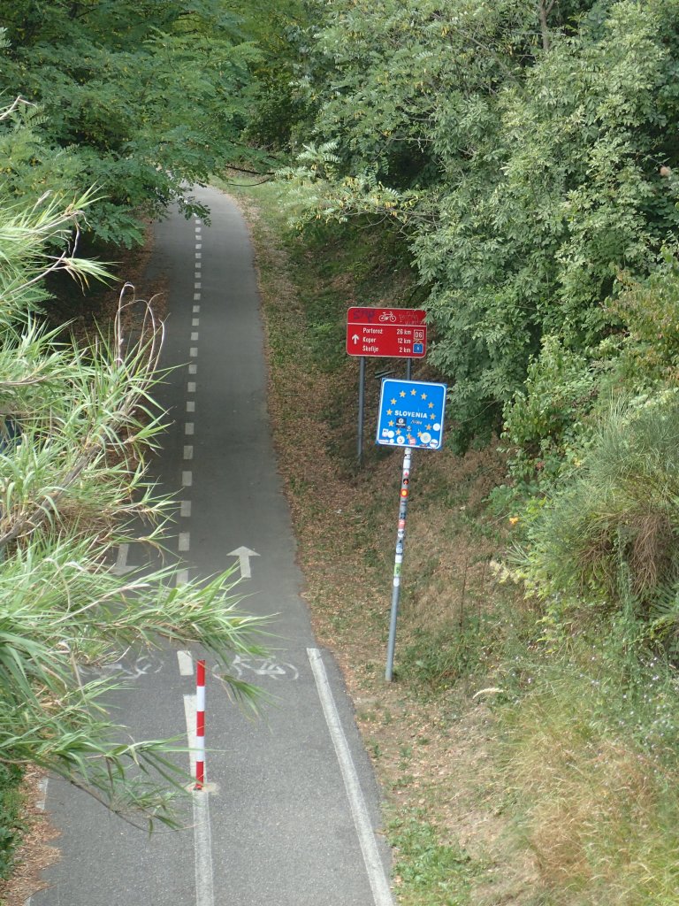 On emerging from the woods, we skirted the village of Caresna before following a new section of the Alpe-Adria that replaced the old trail around one kilometre south. This led us to a rather unattractive industrial estate where we crossed a motorway before heading through a residential area towards the Slovenian border. We didn’t cross it this time, but stayed on the Italian side, catching our final glimpse of Slovenia from a footbridge over a cycle track.