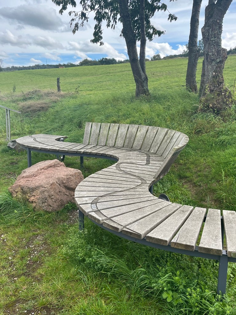 There was another steep climb to a farm track through some meadows (a rarity since Höfen). The Rur was far below, with a road following it now. At one point, I came across a magnificent rest bench for hikers with the Rur’s course marked out on it. A truly beautiful piece of work.