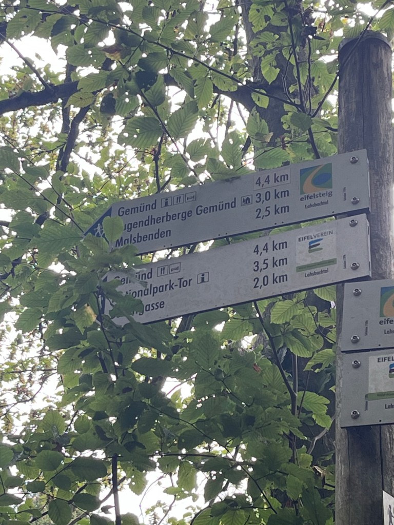 … before climbing to a spot where I had a clear view of Gemünd, my destination. There seemed to be a problem with the signposts indicating distances at this point. One said that Gemünd was 4.4 km away…