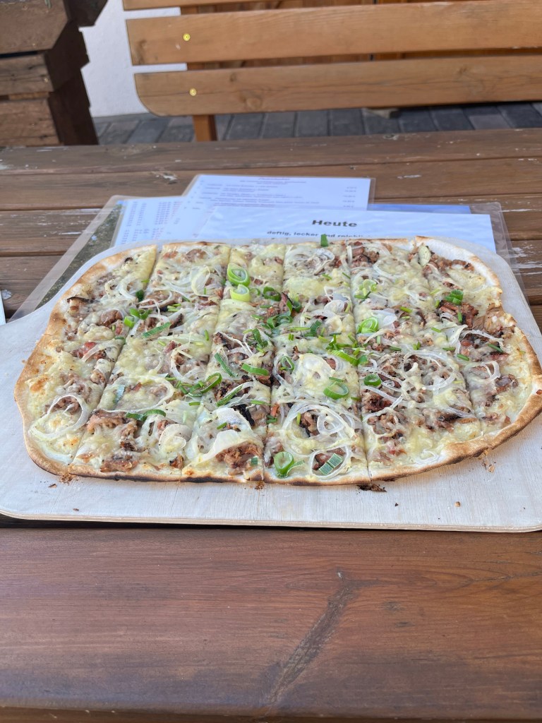 Mirbach was a tiny little place, with one small B&B (no doubt with the four beds mentioned by the Dutch guys), but it did have a terrific hikers’ café that was doing a roaring trade on this sunny Sunday. I took an outside table, and when I ordered a traditional flammkuche (a lighter version of pizza very popular hereabouts), the owner suggested that I try the day’s special made with pulled pork from their own smoker. I took his advice and didn’t regret it: it was delicious!
