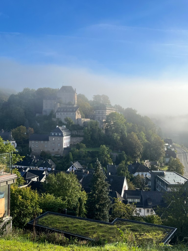 I headed back into Blankenheim to pick up the trail on the main square. There was a Kneipp bath that I hadn’t noticed the previous day just before the square, but my feet weren’t yet tired enough to use it. From the square, it was a steep climb up flights of steps and a road before the trail levelled out, with great views back over the town…