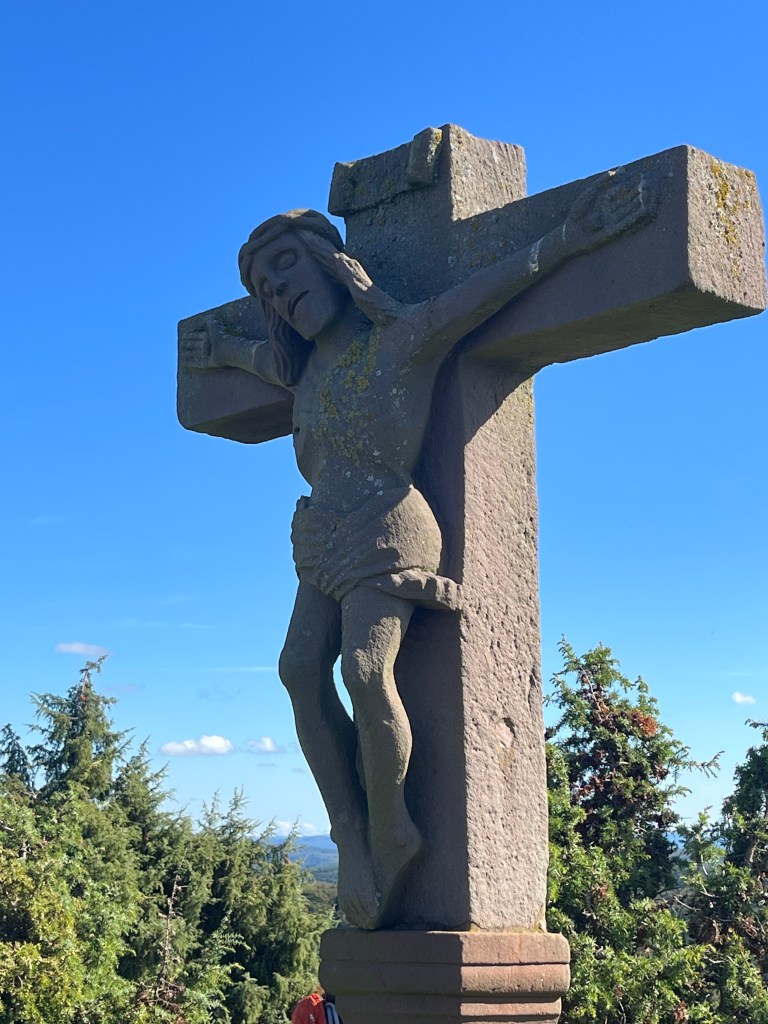 On leaving the village, the trail climbed a steep hill, marked with sandstone carved stations of the cross. There were great views from the top, where a rather despairing looking Jesus marked the final station.