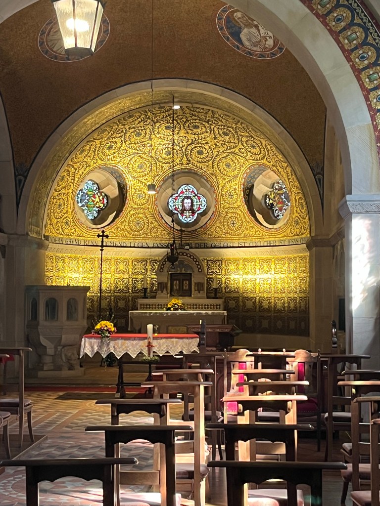 That set me up for the last 10 km into Hillesheim via a route that Komoot prepared for me in a matter of seconds. But before leaving the village, I went to take a look at the Chapel of the Redeemer on the hill behind the café. Dating from the early 1900s, the exterior vaguely reminded me of what remains of the Gedächtniskirche, the bombed out emblem of West Berlin. This impression was confirmed inside by the mosaics that resembled those that remain in the church in Berlin. It was a very ornate chapel for such a small village.