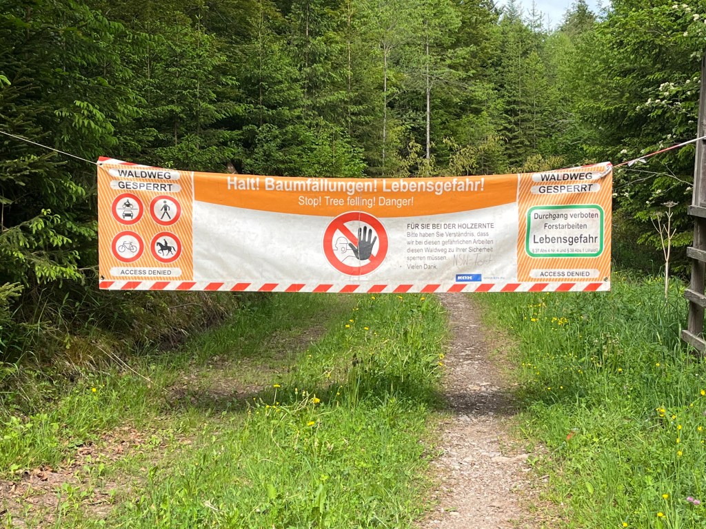 So I decided not to forge ahead like an idiot on the virtually blocked Ostweg but to turn back along it now I had found it. After climbing over and around countless trees, I came upon, from behind, a huge banner closing the trail for logging work that would have been immediately apparent if I had been on the Ostweg from Pfalzgrafenweiler and had approached from the right direction. By that time, through a mixture of stubbornness and stupidity, I’d wasted a good hour and was pretty tired from climbing over all the trees.