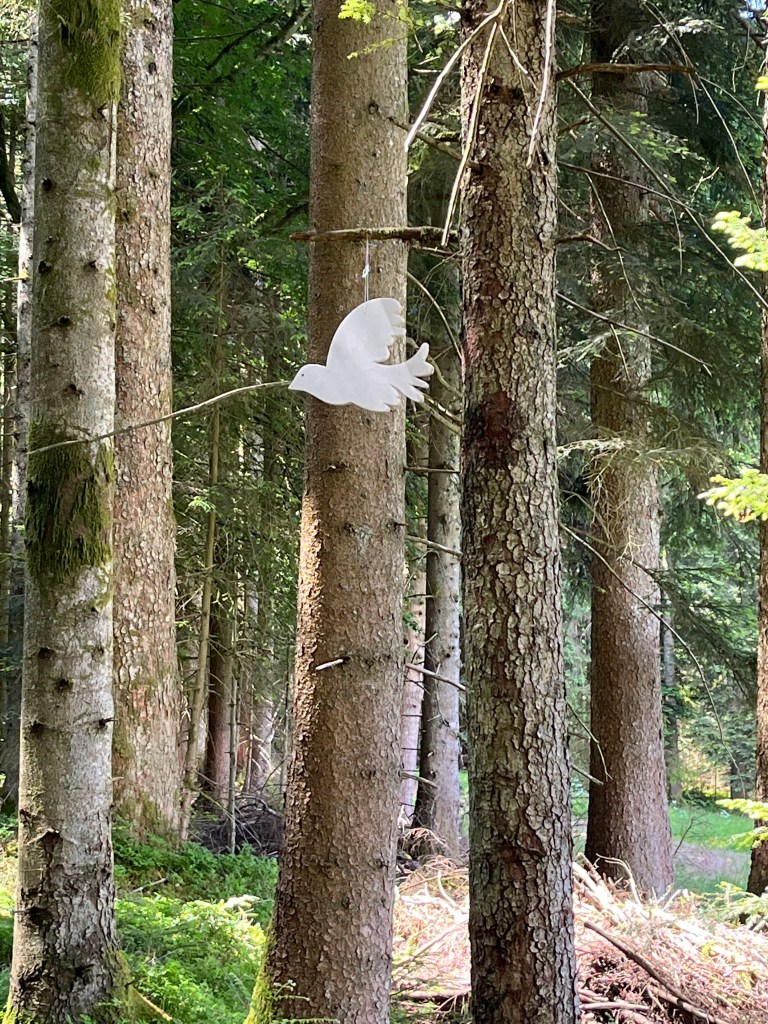 At one point, I found myself on an old Roman road, with markers and statues. Alongside it, there was a narrower trail that the Ostweg followed and that had a peace theme, with quotations on signs and cut-out doves hanging from the trees.