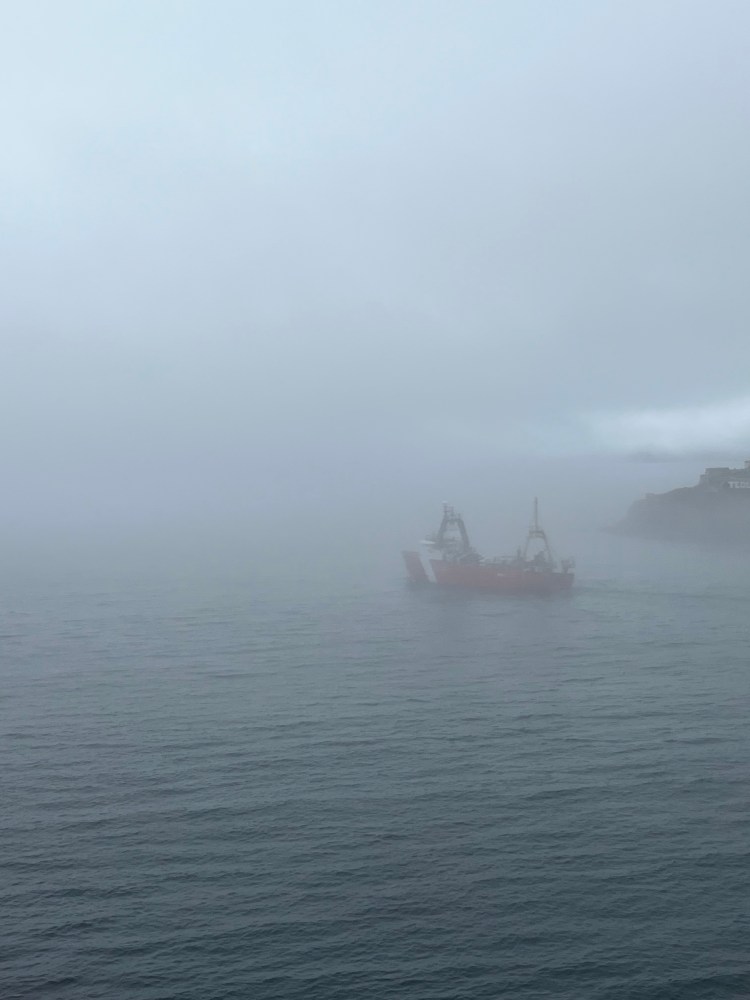 The following morning, we set off for a real hike, the North Head Trail below Signal Hill (where the first radio transmission from Europe to North America was received) and then to the village of Quidi Vidi. A Canadian lady at the B&B had done it the previous day and told us horror stories of cabled sections and having to crawl over parts of the 14-km trail. This surprised us as, even taking in Quidi Vidi (which she hadn’t), our apps indicated a 10-km trail, tops. The lady in question was clearly not an experienced hiker but, all the same, we set off unsure of what to expect. The sky was blue when we left and, after leaving the city streets and heading uphill (with instructions from a friendly local whom we would meet again the next day), we found the trail “next to the house with the red roof”. However, by that point, we were starting to experience a phenomenon that we had witnessed on arriving the day before: the fog. As in San Francisco, banks of fog regularly roll in to St John’s from the open sea and create a terrific atmosphere.