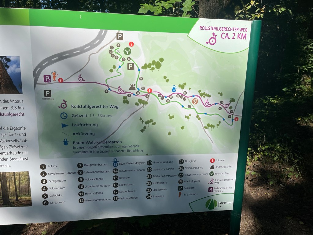 The trail then returned to the woods. Shortly after, I was surprised to find a section 2 km long that had been adapted for wheelchair users. There was a large car park with spaces set aside for the disabled and the 2-km trail allowed people to discover all the different kinds of trees growing in the forest. I had never seen anything like this before, and I was impressed by the efforts made to allow the disabled to get out into the woods.