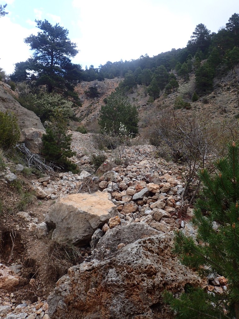 When the trail finally left the road, things became much more intense. I continued to head uphill, but now in an area that seemed to have been devastated by one of the flash floods that occurred in this area the previous year. I was heading along a gully where the terrain had been churned up to such an extent that I was hopping from rock to rock to make my way up. And, to add to the fun, some of those rocks were pretty unstable. It was a tricky and exhausting climb that left me cursing and drenched in sweat, even though it was a fairly cool morning.