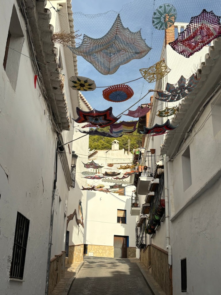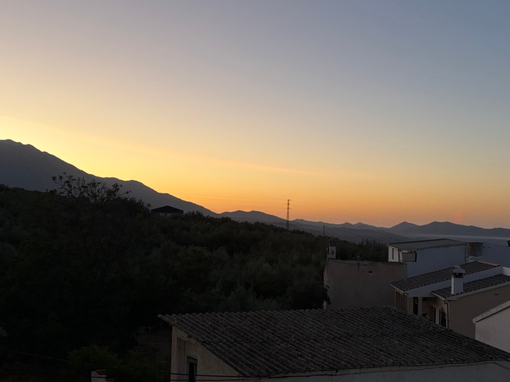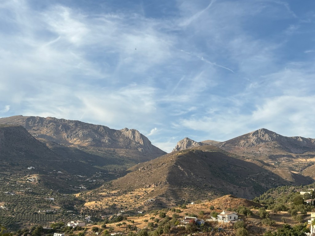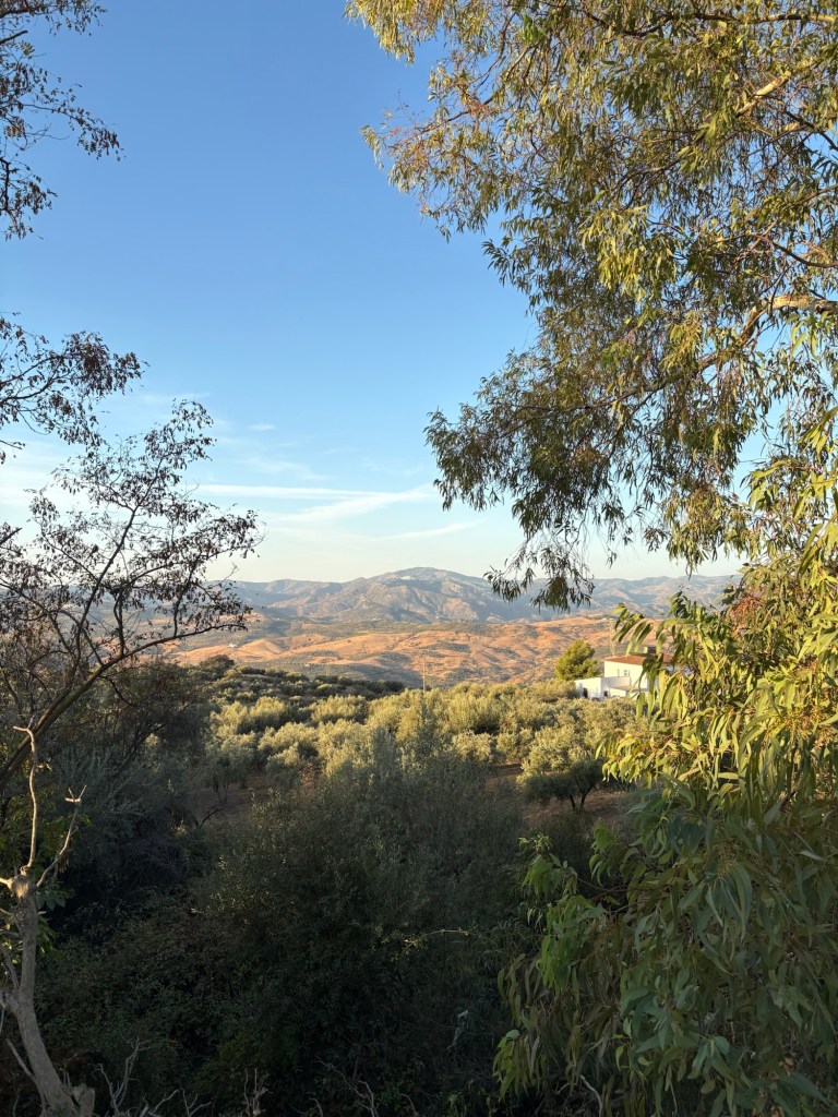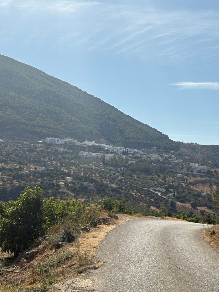 The trail leads up to a ridge from which we are finally able to Alcaucín, our destination, in the distance. The white houses of the village spread out over the mountainside before us make an attractive sight, until we realize that to reach them we need to make a steep descent into the valley followed by a long climb.