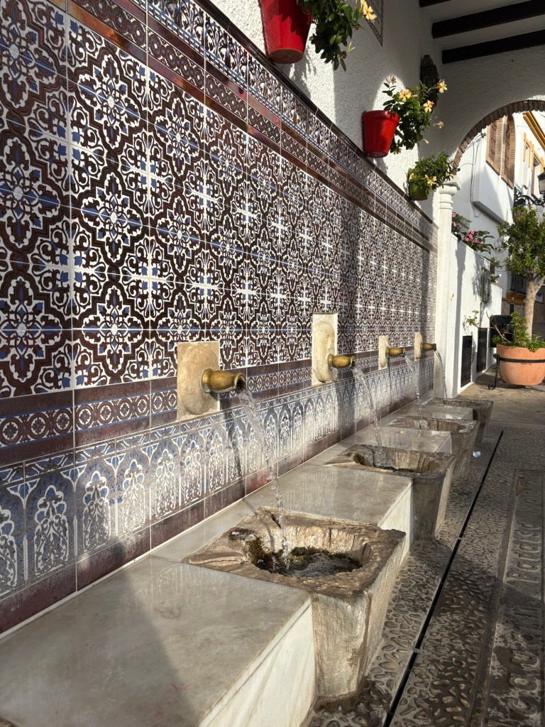 We arrive in the pretty village, passing a fine municipal swimming pool that unfortunately doesn’t seem to be open, and head to a square just outside our hotel where we’ll be able to check in two hours from now. There’s a magnificent Moorish-style fountain on the square that wouldn’t be out of place outside an Istanbul mosque.
