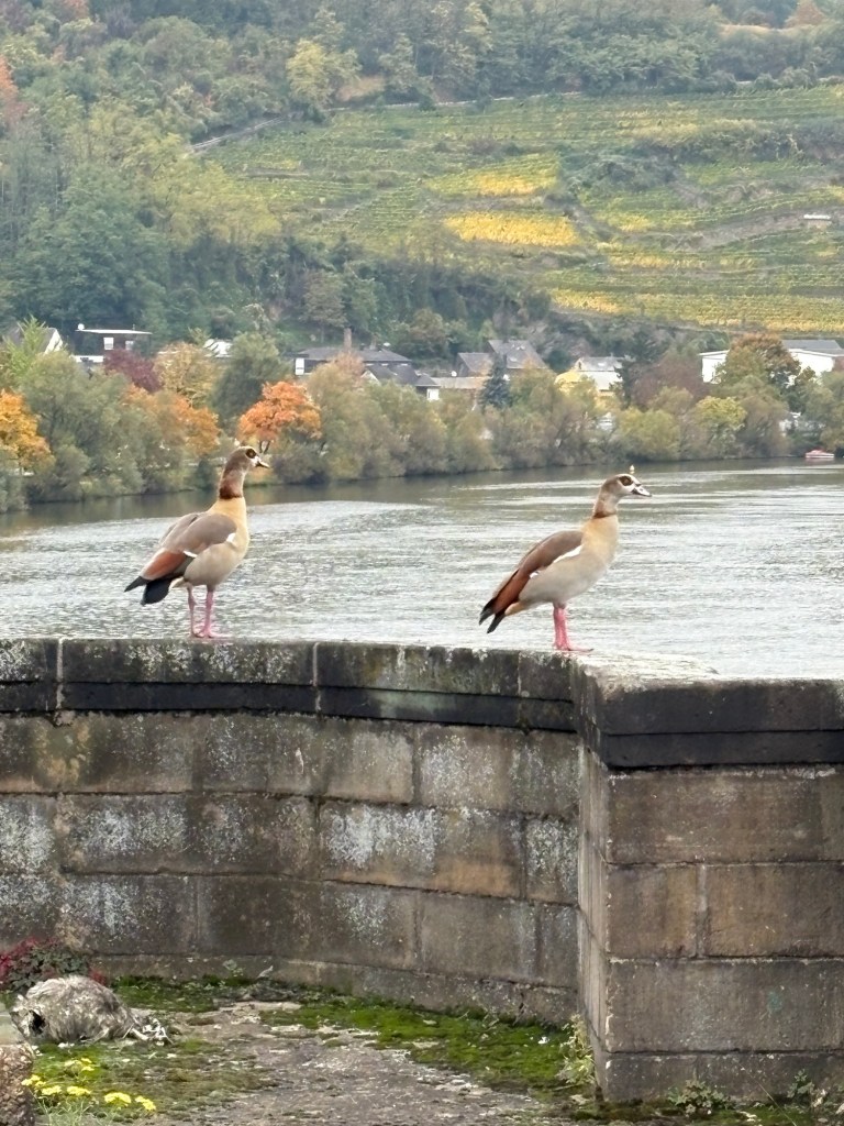 In the centre of Güls, the trail crosses the Moselle for the last time, on a pedestrian walkway at the side of the railway bridge that I shall be travelling back over tomorrow on my journey home. There are two magnificent Egyptian geese perched on a parapet. The first ones I saw were at the end of my first day on the Moselsteig a year ago so it seems fitting that this couple should show up today.
